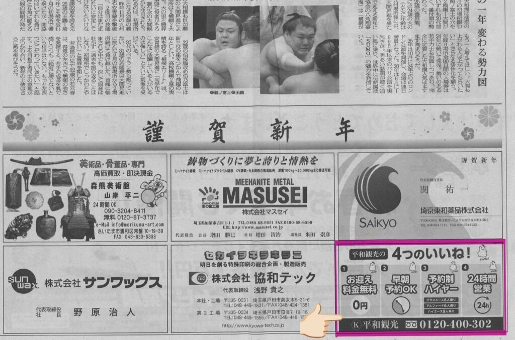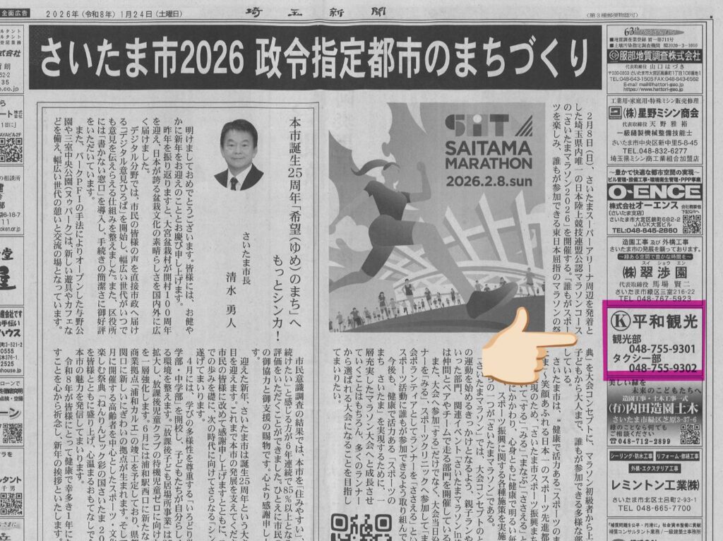 平和観光はR8.1/1とR81/24に埼玉新聞にて協賛を行いました。